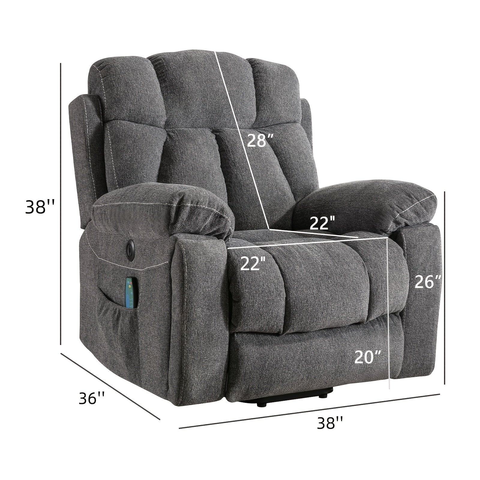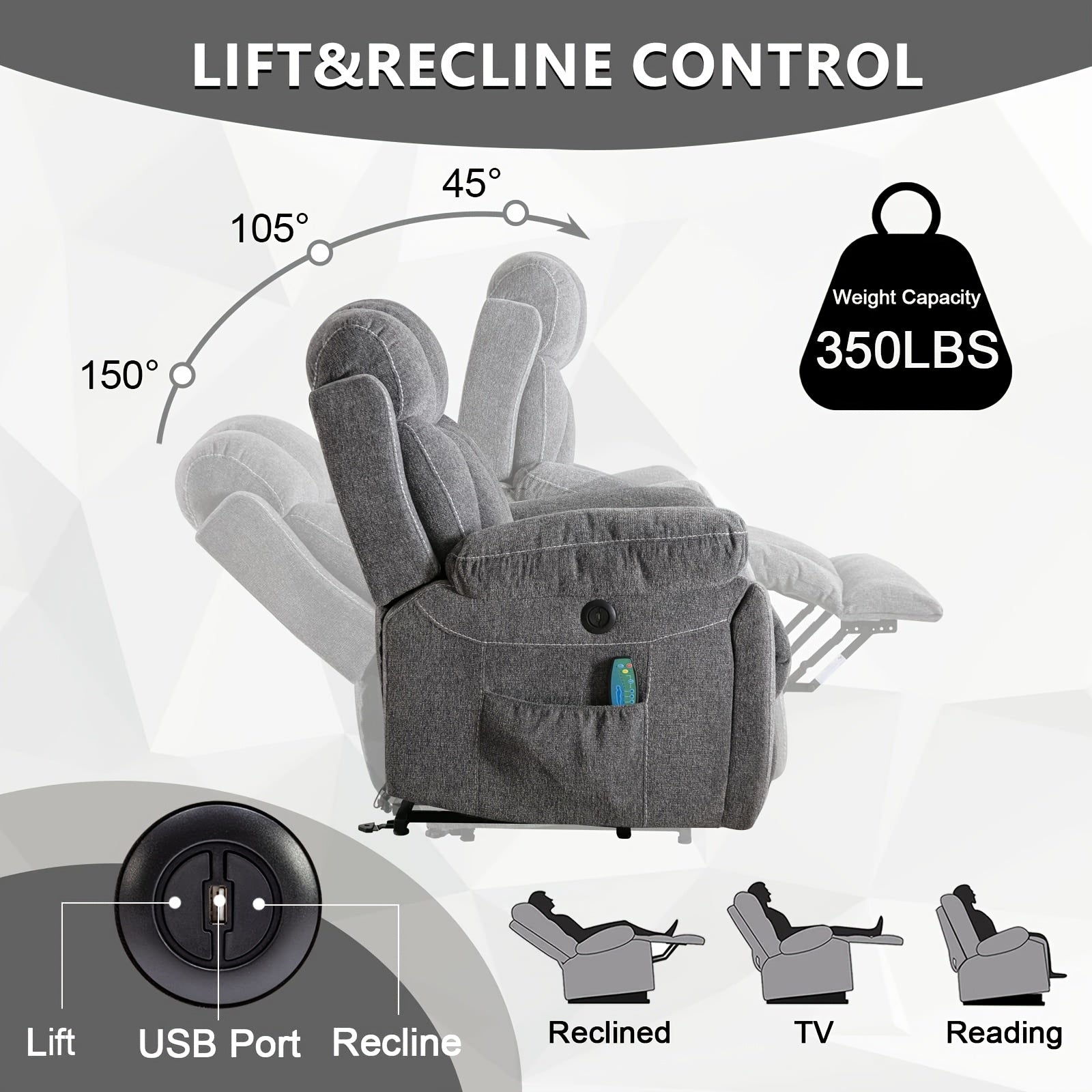 Power Lift Recliner Chair, Large Heavy-Duty Wide Overstuffed with Massage & Heat, Adjustable Height, USB Port & Cup Holders, for Elderly & Seniors, Plush Microfiber Upholstery, Gray, Easy Assembly